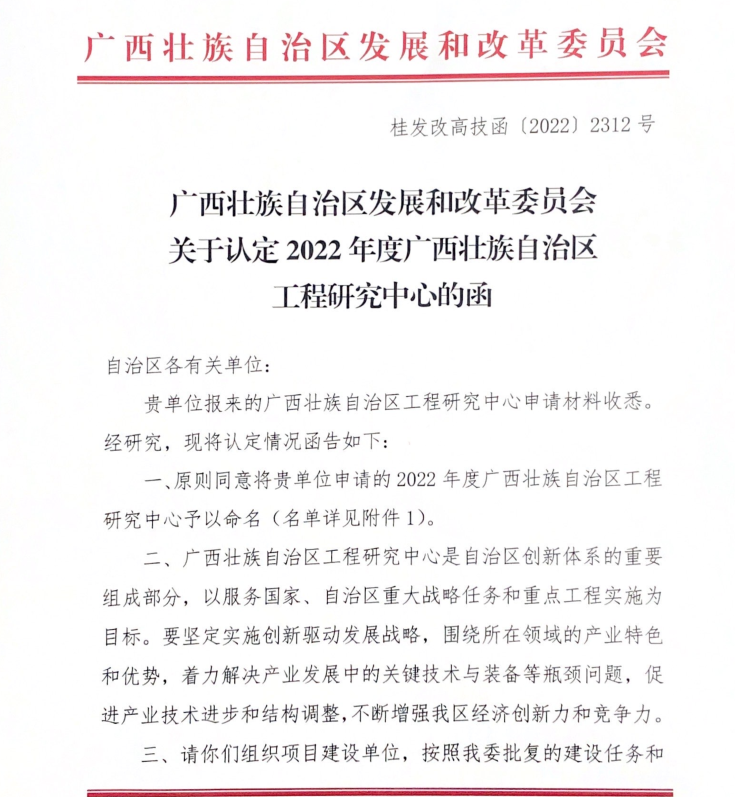近日,从自治区发改委下发《广西壮族自治区发展和改革委员会关于认定2022年度广西壮族自治区工程研究中心的函》(桂发改高技函〔2022〕2312 号)获悉,依托我校申报的“广西壮族自治区农业面源污染综合治理工程研究中心”和“广西壮族自治区智能橡胶装备工程研究中心”被认定为自治区工程研究中心,至此,我校已有自治区工程研究中心6家。