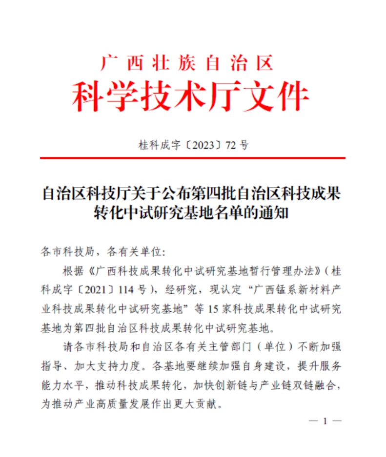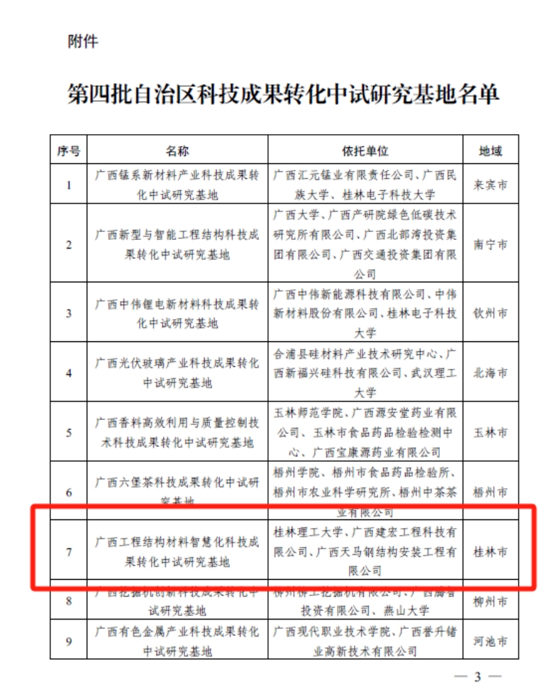 近日获悉,自治区科技厅公布了第四批自治区科技成果转化中试研究基地名单的通知(桂科成字〔2023〕72 号),我校“广西工程结构材料智慧化科技成果转化中试研究基地”被认定为自治区科技成果转化中试研究基地,至此,我校已有3家自治区科技成果转化中试研究基地。